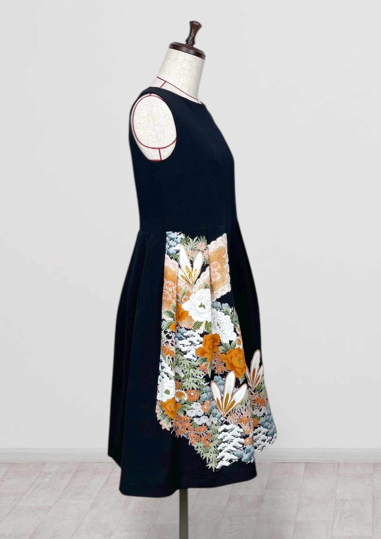 高い位置から大きく絵柄が広がる、豪華なデザインが目を引くワンピース。