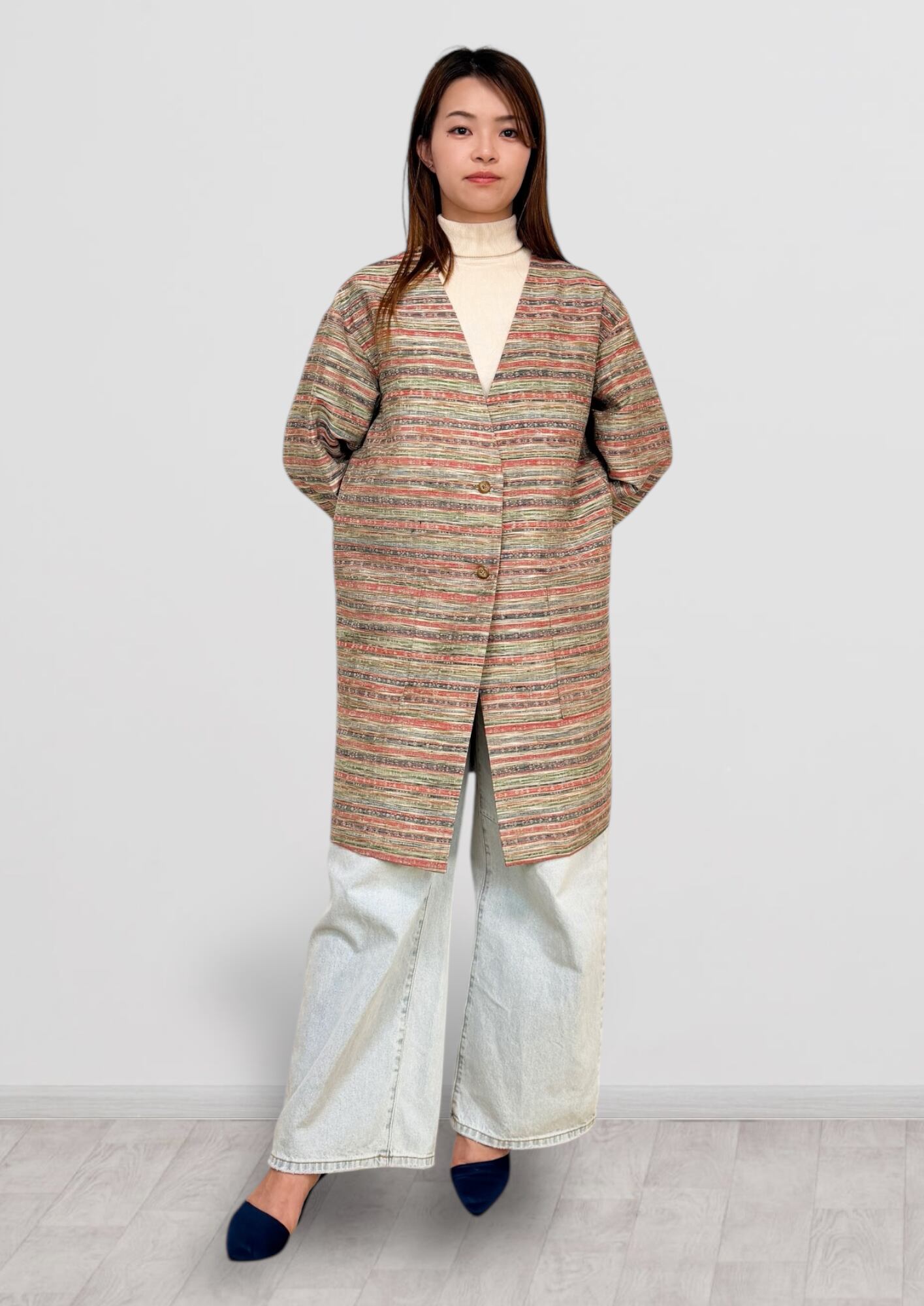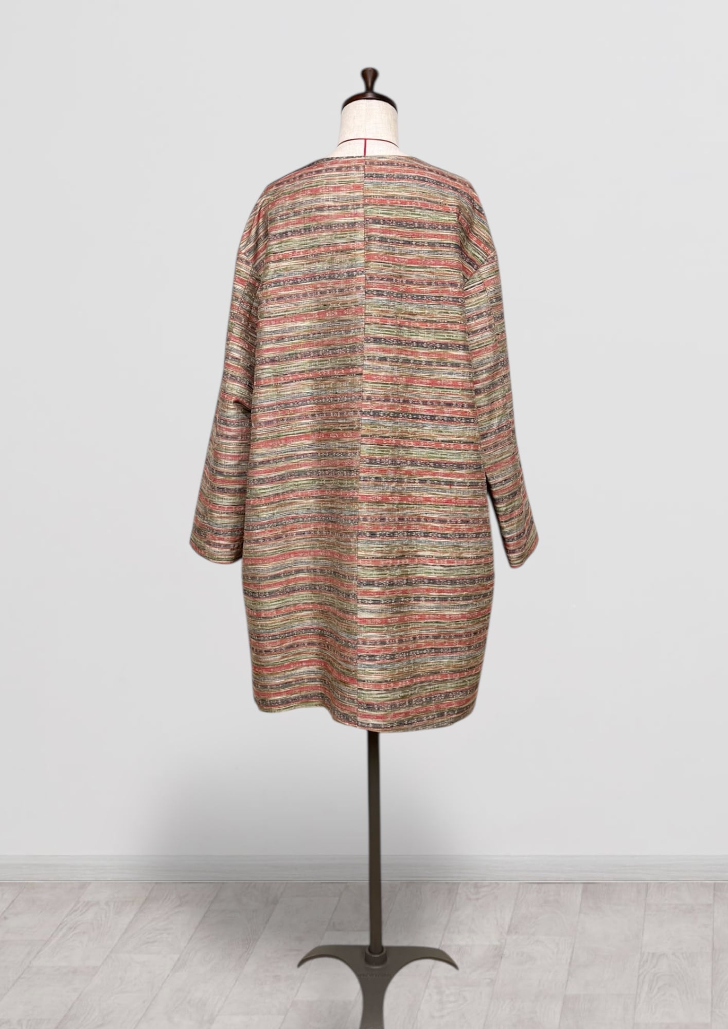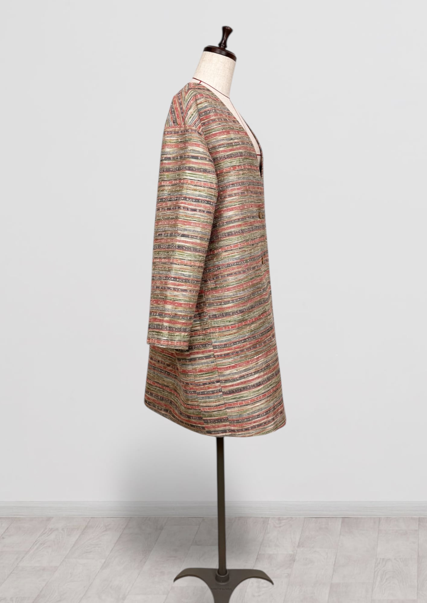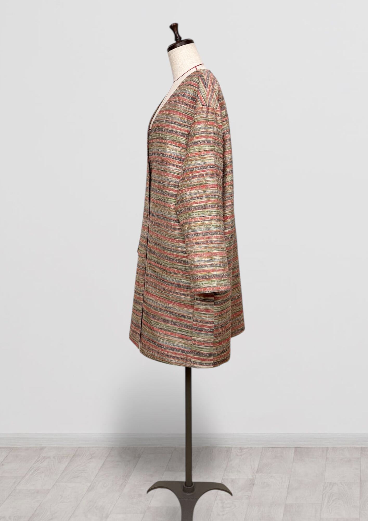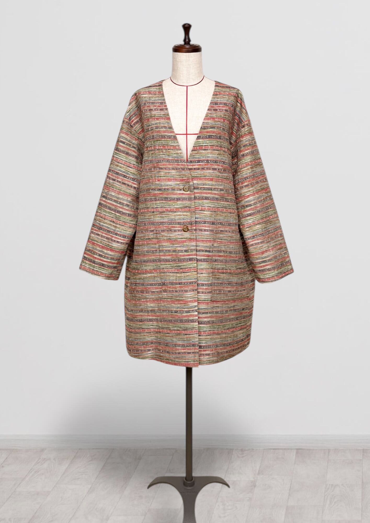 Vネックコート Mサイズ ミドル丈 ポケット付き 紬 ボーダー柄