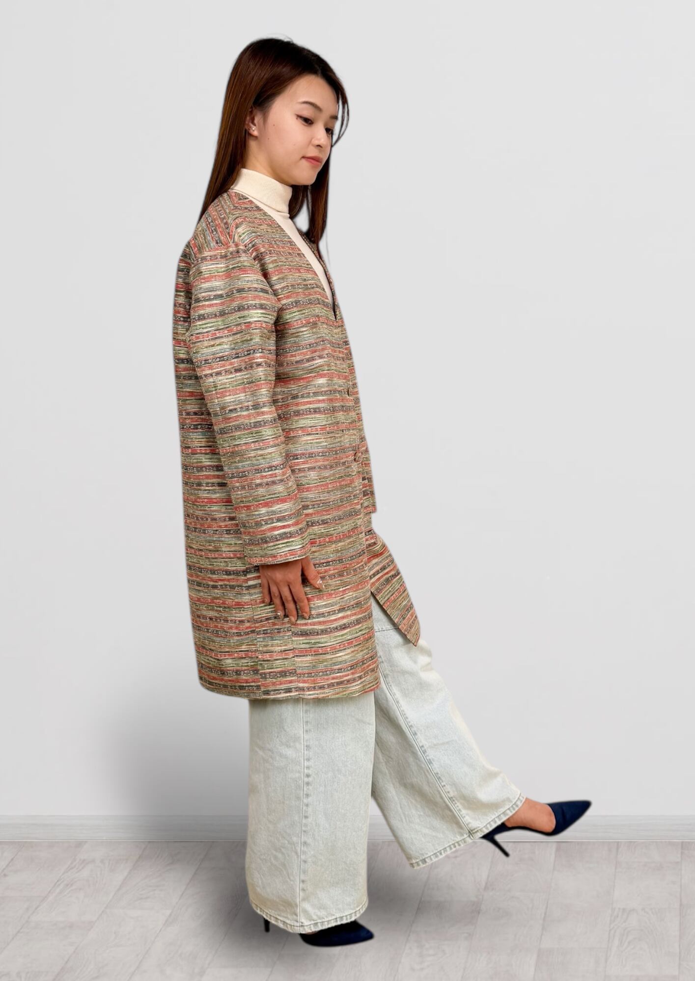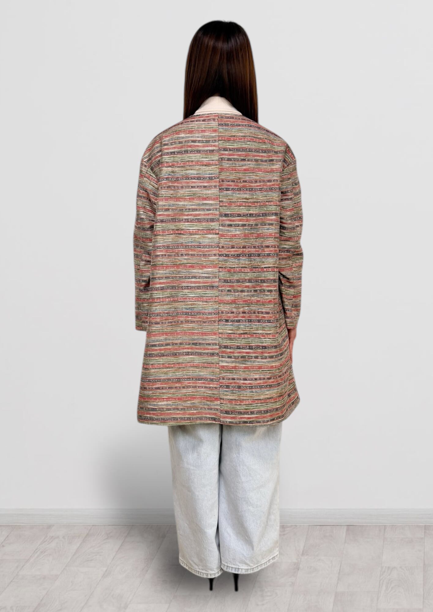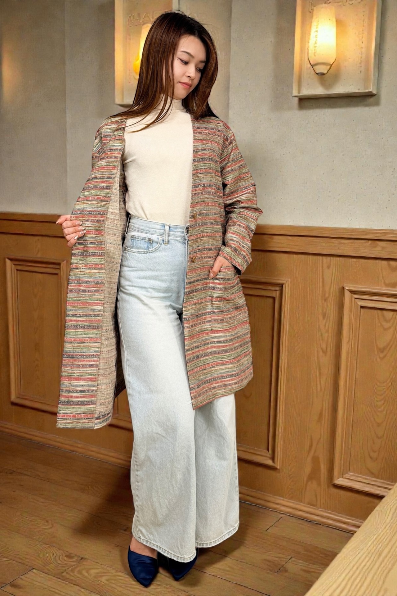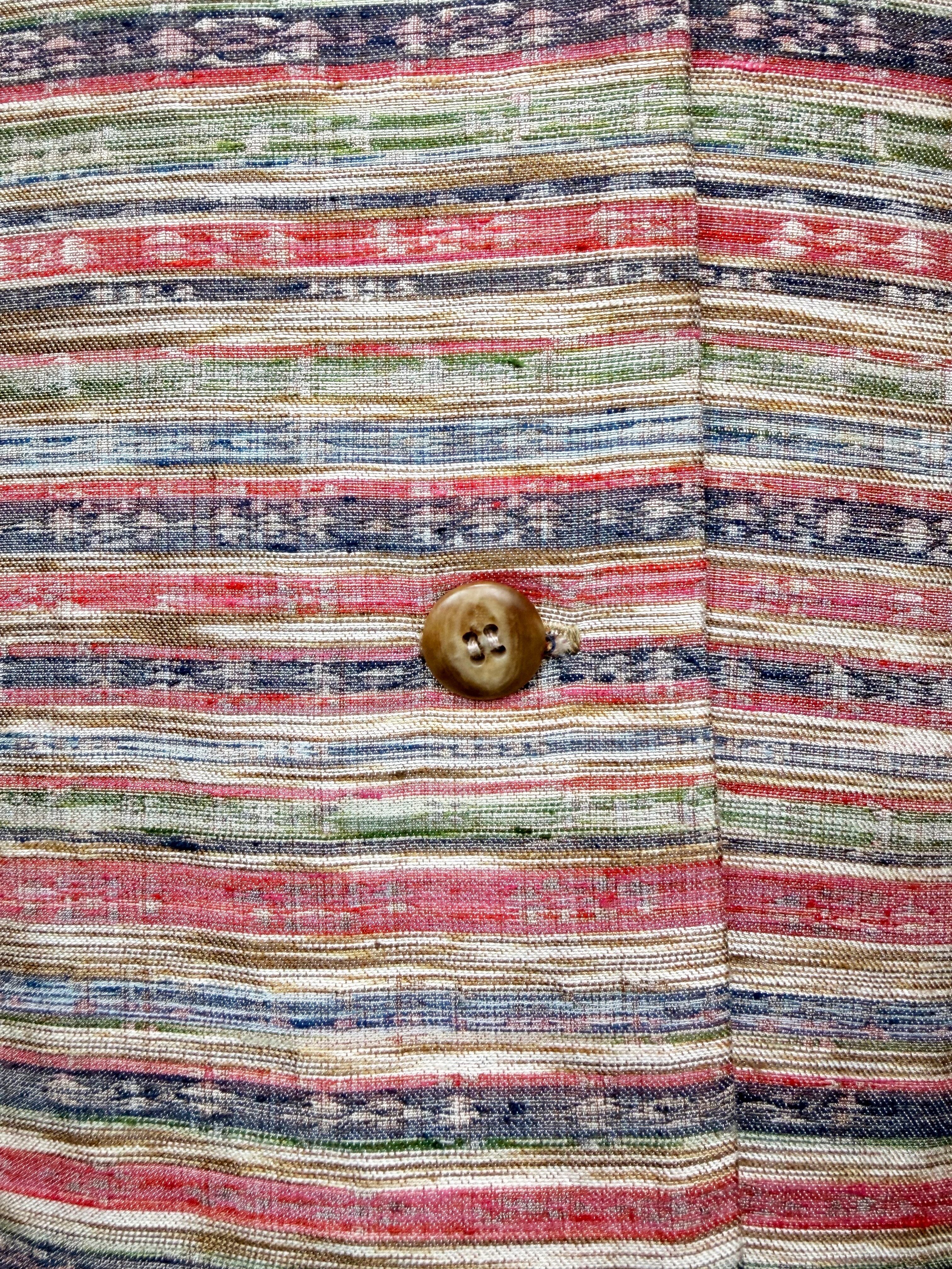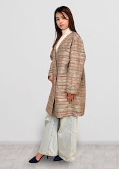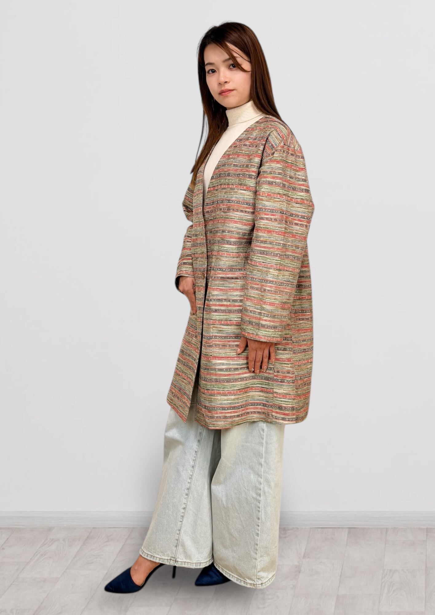 Vネックコート Mサイズ ミドル丈 ポケット付き 紬 ボーダー柄